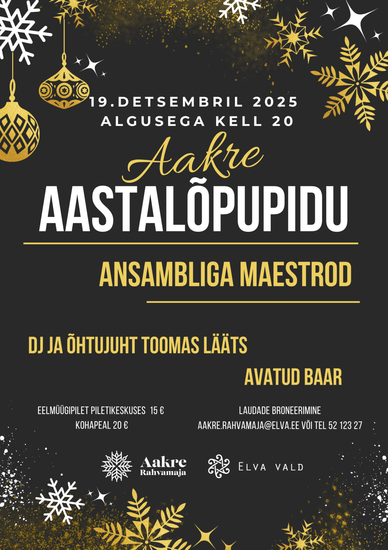 Broneeri laud aakre.rahvamaja@elva.ee või tel 52 123 27. Lauda saab broneerida kuni 17.12.2025 või kuni kohti jätkub!