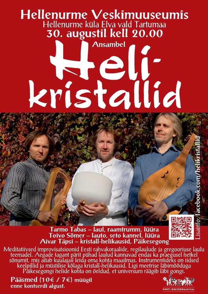 Suvelõpu mõtluskontsert Hellenurme Veskimuuseumis! Parim, mis Sinuga juhtada saab, on see, et leiad hetke meenutamiseks, elust-olust või lihtsalt kaunist suvest ja kogud mõttejõudu, et külmale ajale vastu minna. HELIKRISTALLID annavad selle võimaluse 30. AUGUSTIL KELL 20.00 Hellenurme vesiveskis.