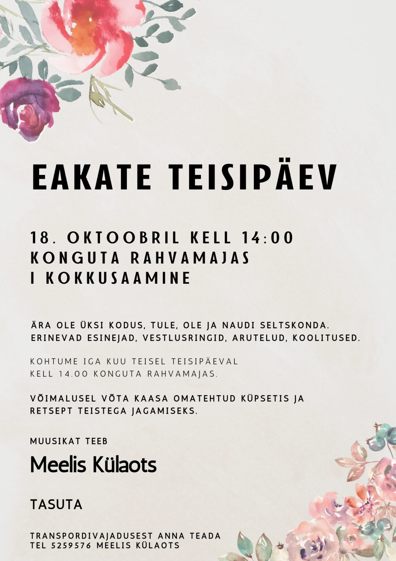 Kohtume iga kuu teisel teisipäeval kell 14.00 Konguta rahvamajas.