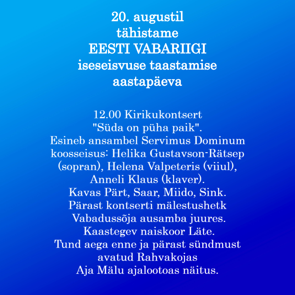 Kell 12.00 Puhja kirikus kontsert “Süda on püha paik”. Esineb ansambel Servimus Dominum koosseisus: Helika Gustavson-Rätsep (sopran), Helena Valpeteris(viiul), Anneli Klaus (klaver). Kavas Pärt, Saar, Miido, Sink.