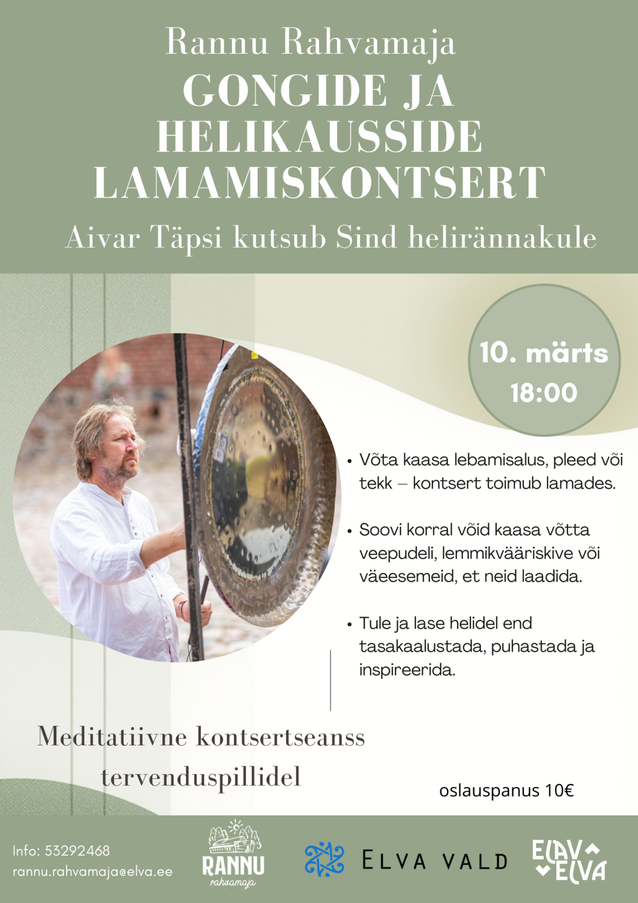 Soovitused osalejale: Võta kaasa lebamisalus, pleed või tekk – kontsert toimub lamades. Soovi korral võid kaasa võtta veepudeli, lemmikvääriskive või väeesemeid, et neid laadida.
