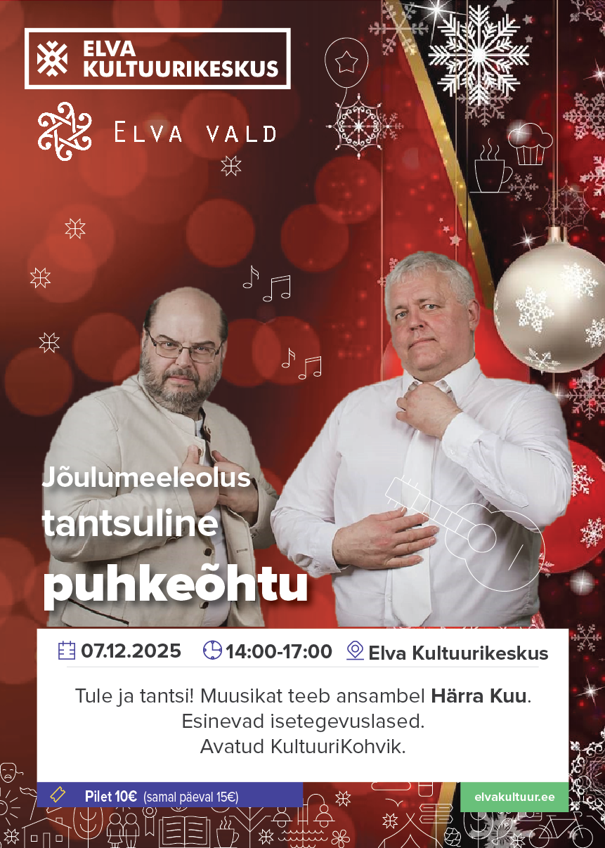 Jõulumeeleolus Elva Kultuurikeskus kutsub tantsulisele pärastlõunale. Tantsumuusikat teeb Härra Kuu.