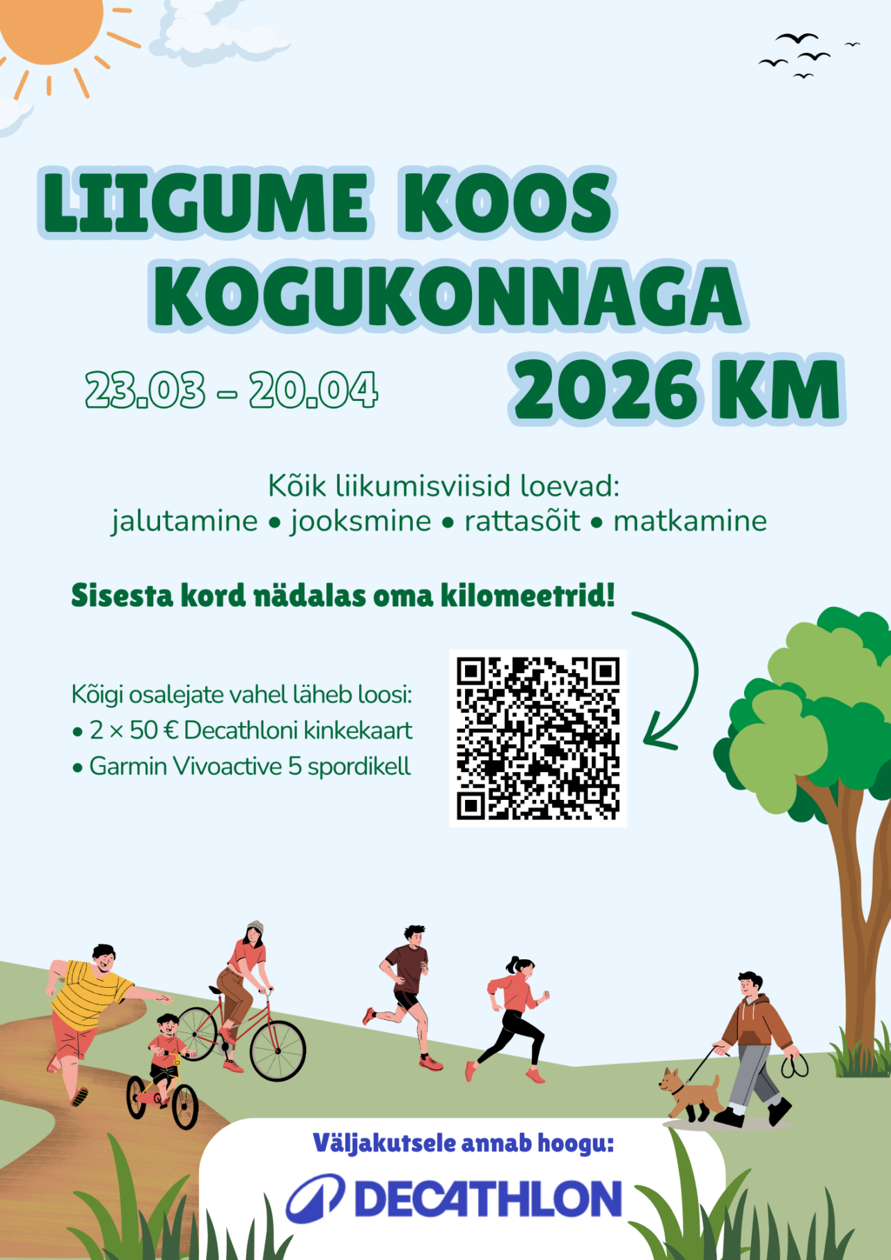Kutsume kõiki osa võtma meie ühisest kevadiset liikumisväljakutsest! 🎯 Eesmärk on koguda ajavahemikus 23.03–20.04 kokku 2026 kilomeetrit.