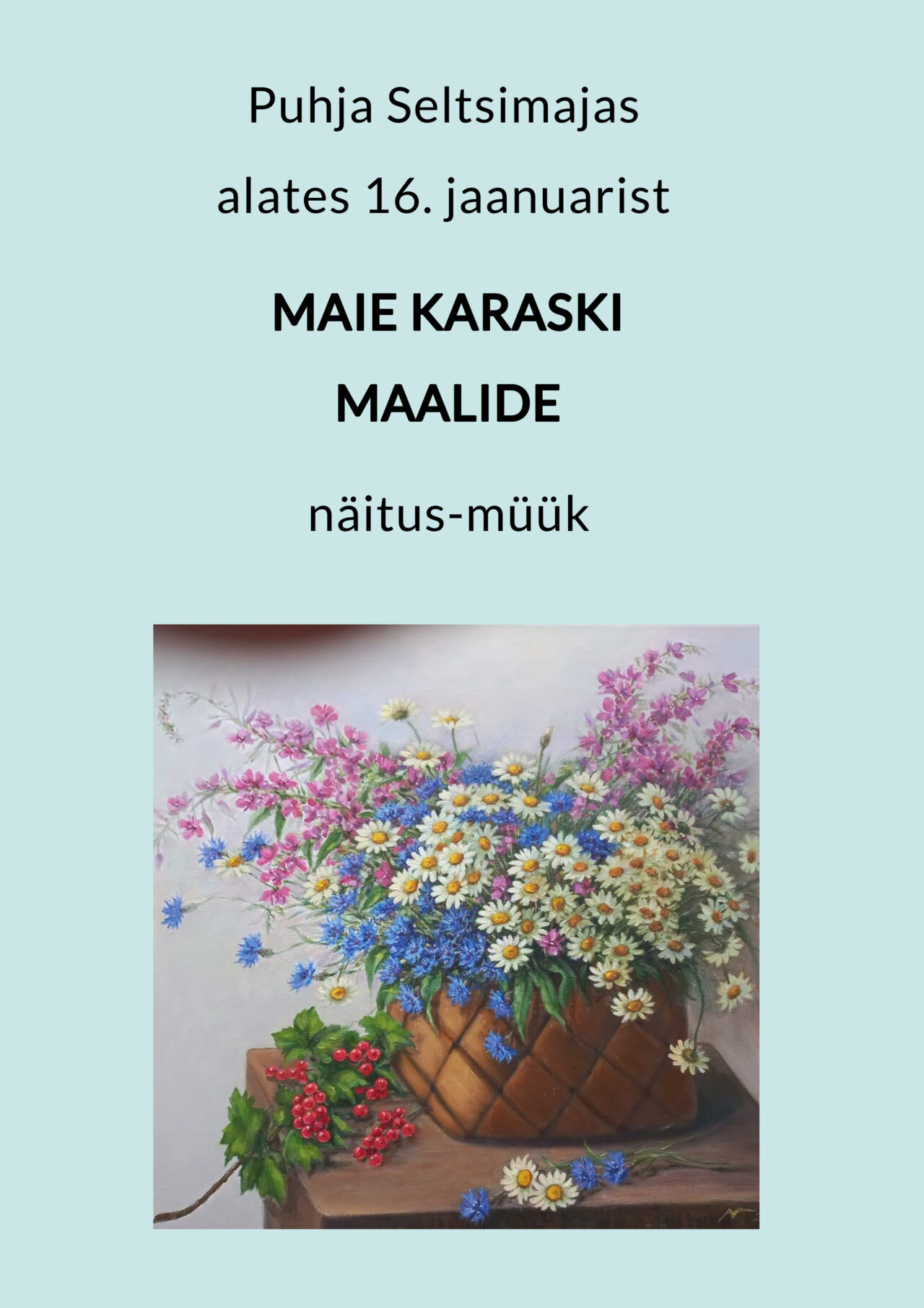 Maie Karask on Põlva kunstnik. Jaanuari keskpaigast kuni märtsi lõpuni saab tema töid imetleda Puhja Seltsimajas.