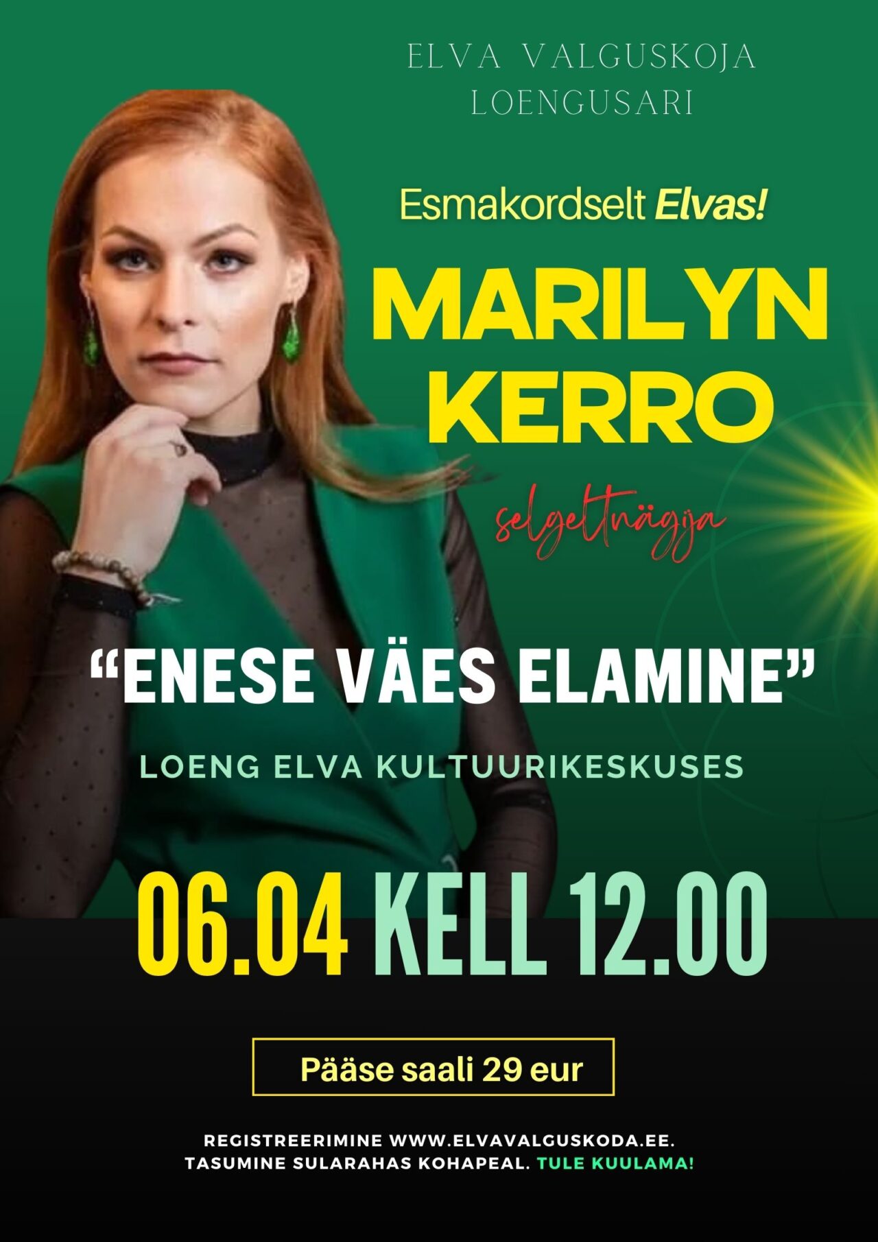 Elva Valguskoja loengusarja kevadine ettekanne toob Elvasse esineja, kes ei vajagi lähemat tutvustust. Esmakordselt tuleb Elvasse Marilyn Kerro, kelle ettekanne seab esikohale inimeseks olemise- õigupoolest selle, kuidas elada enese väes. Kuidas hoida enese energiaid ja jõuda taas sisemise jõu lättele? Kas pole nii, et kui usaldad ennast, austad enese soove ja tead, millises suunas tahad elus liikuda, jõuadki lähemale voole, mis sarnaneks müstilise elujõena?
