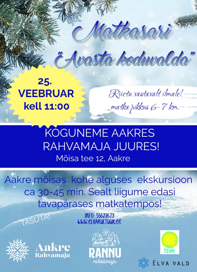 Matkasarjas “Avasta koduvalda” kohtume veebruaris Aakres. Saame kokku kohaliku rahvamaja juures (Mõisa tee 12, Aakre).
