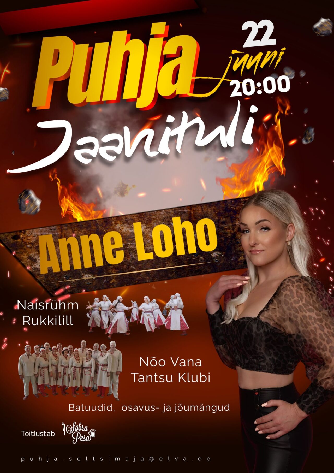 Esinevad naisrühm Rukkilill ja Nõo Vana Tantsu Klubi. Süütame jaanilõkke ja siis saab juba Anne Loho mõnusate tantsulugude saatel jalga keerutada iga jaanituleline.