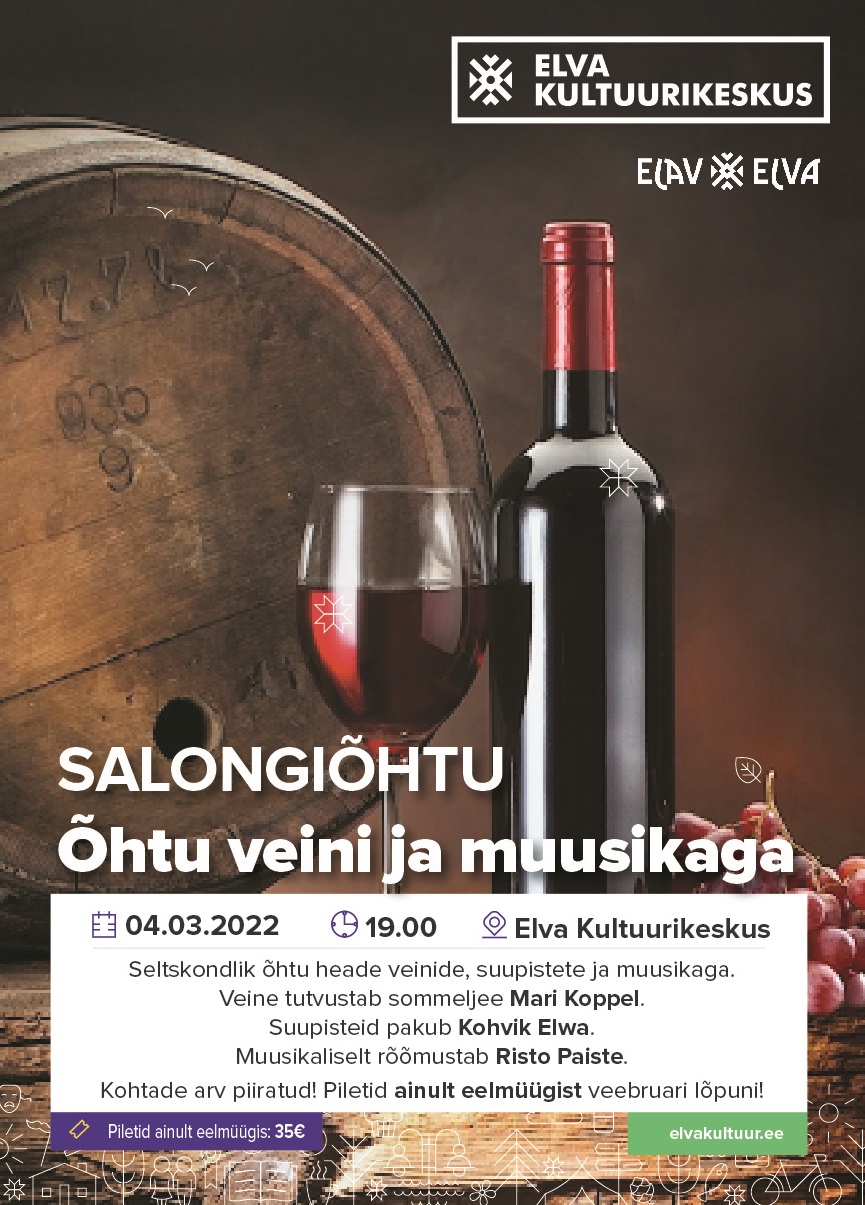 Sissejuhatus veinimaailma. Sommeljee Mari Koppel tutvustab veinimaailma erinevaid eksemplare – vahuveinid, punased veinid, valged veinid. Õhtu lõpetab magus üllatus. Veinide kõrval pakub suupisteid Kohvik Elwa. Salongiõhtu on vürtsitatud mõnusa muusikaga mida serveerib Risto Paiste.