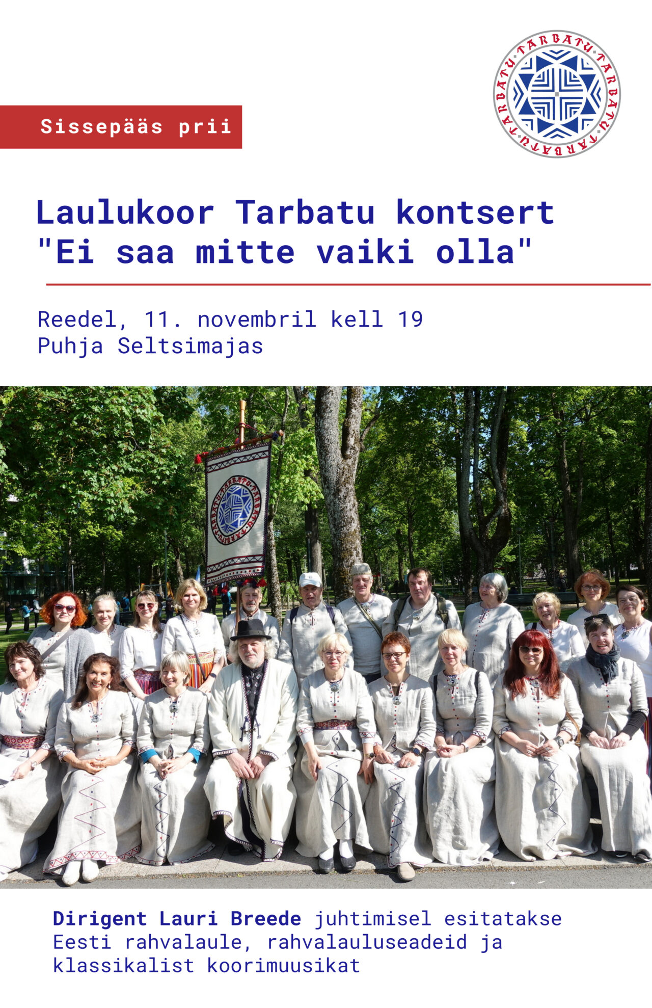 Dirigent on Lauri Breede juhatamisel esitatakse Eesti rahvalaule, rahvalauluseadeid ja klassikalist koorimuusikat.
