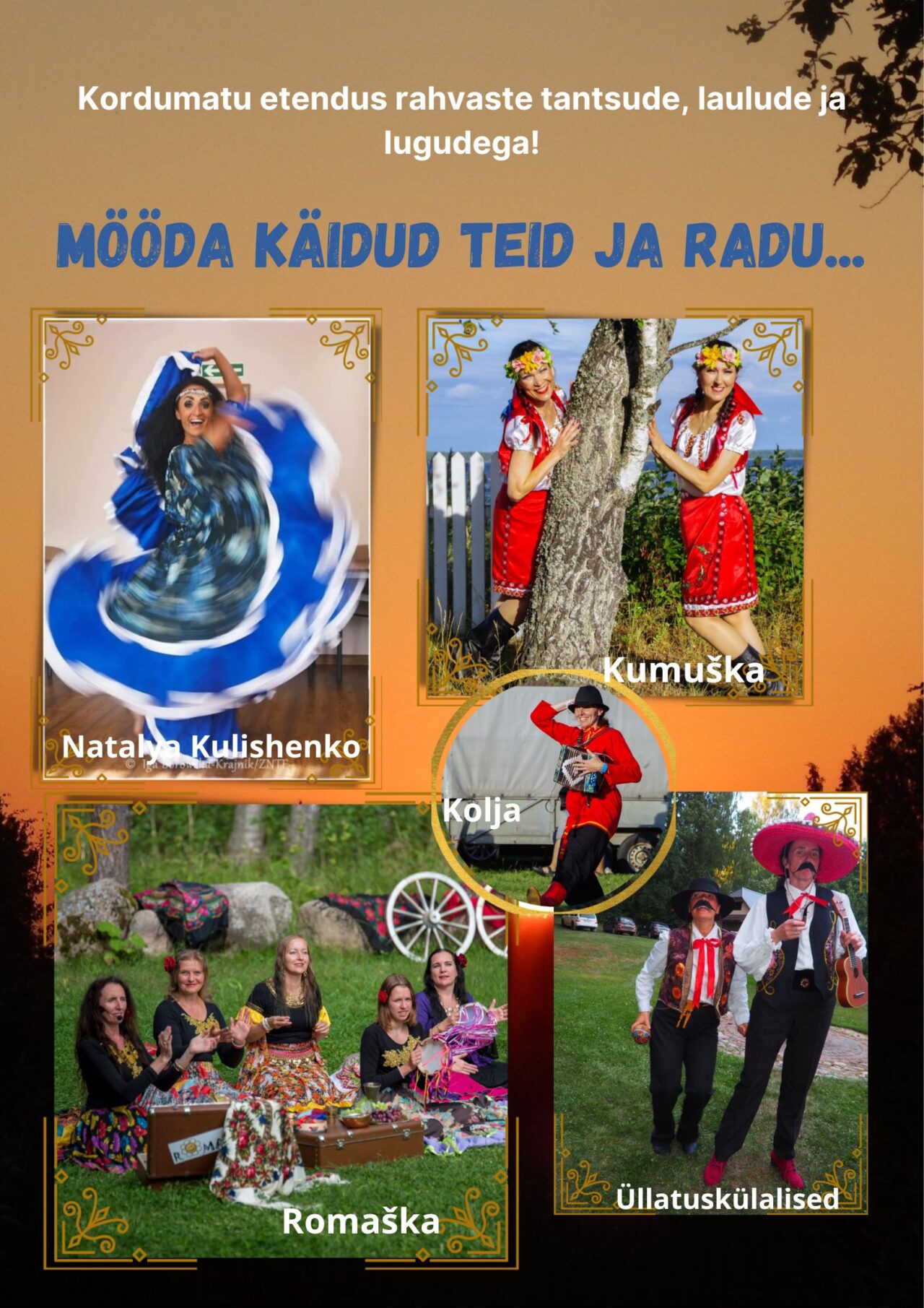 Laval on mustlastantsugrupp Romaška ja duett Kumuška tantsijad, lauljad ja karakterid. Erikülalisena Ukrainast särav Natalya Kulishenko ja Elva flamenkotantsutrupi tantsijad. Näha saab vene mustlaste, rumeenlaste, kreeklaste, juutide tantsu, hispaanlaste flamenkot ja isegi idamaist tantsu. Üllatusi on veelgi. Tule osa saama energiast ja värvidest!