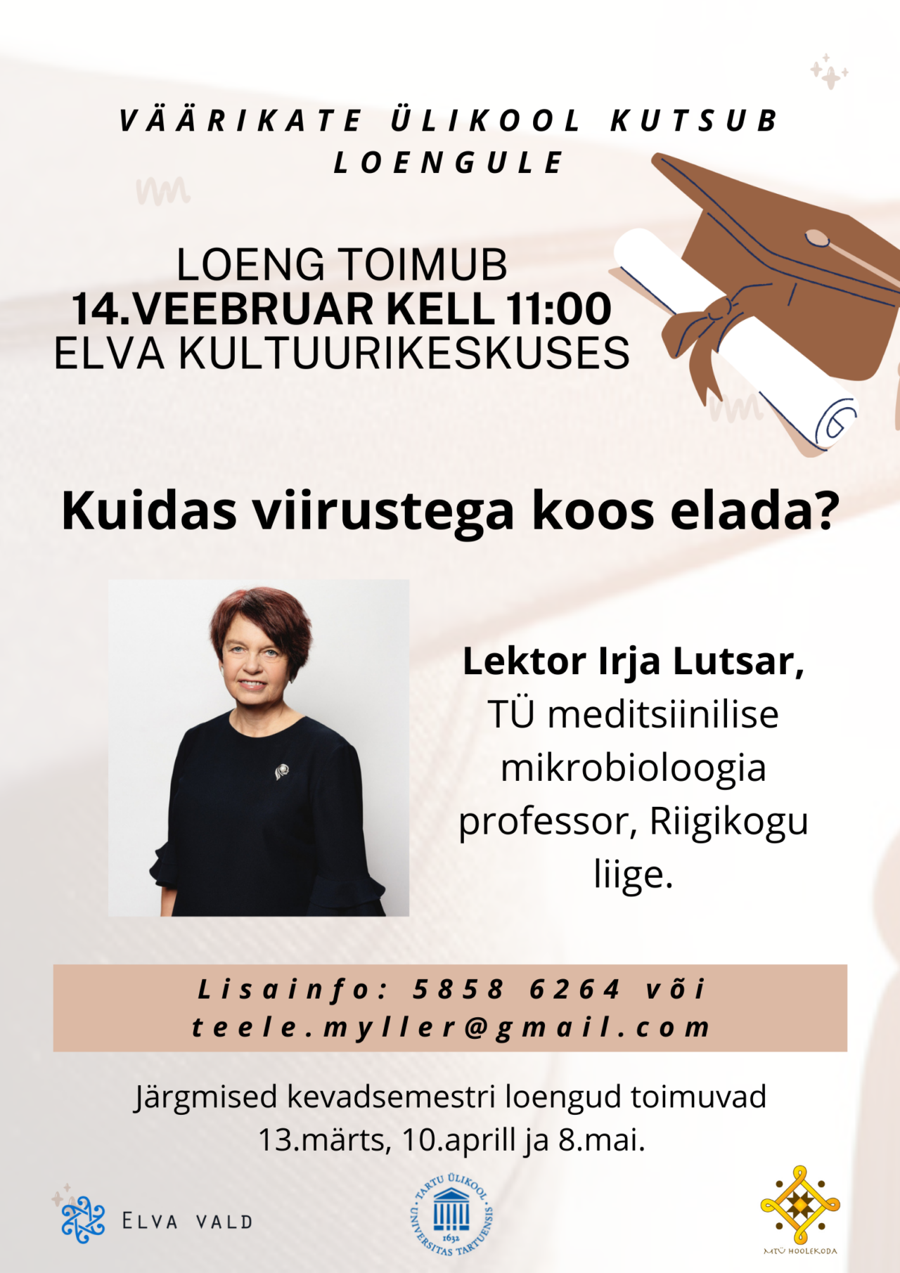 Järgmine oluline loeng toimub 14. veebruaril kell 11 Elva Kultuurikeskuses teemal “Kuidas viirustega koos elada?”. Loengu viib läbi lektor Irja Lutsar, kes on TÜ meditsiinilise mikrobioloogia professor ja Riigikogu liige.