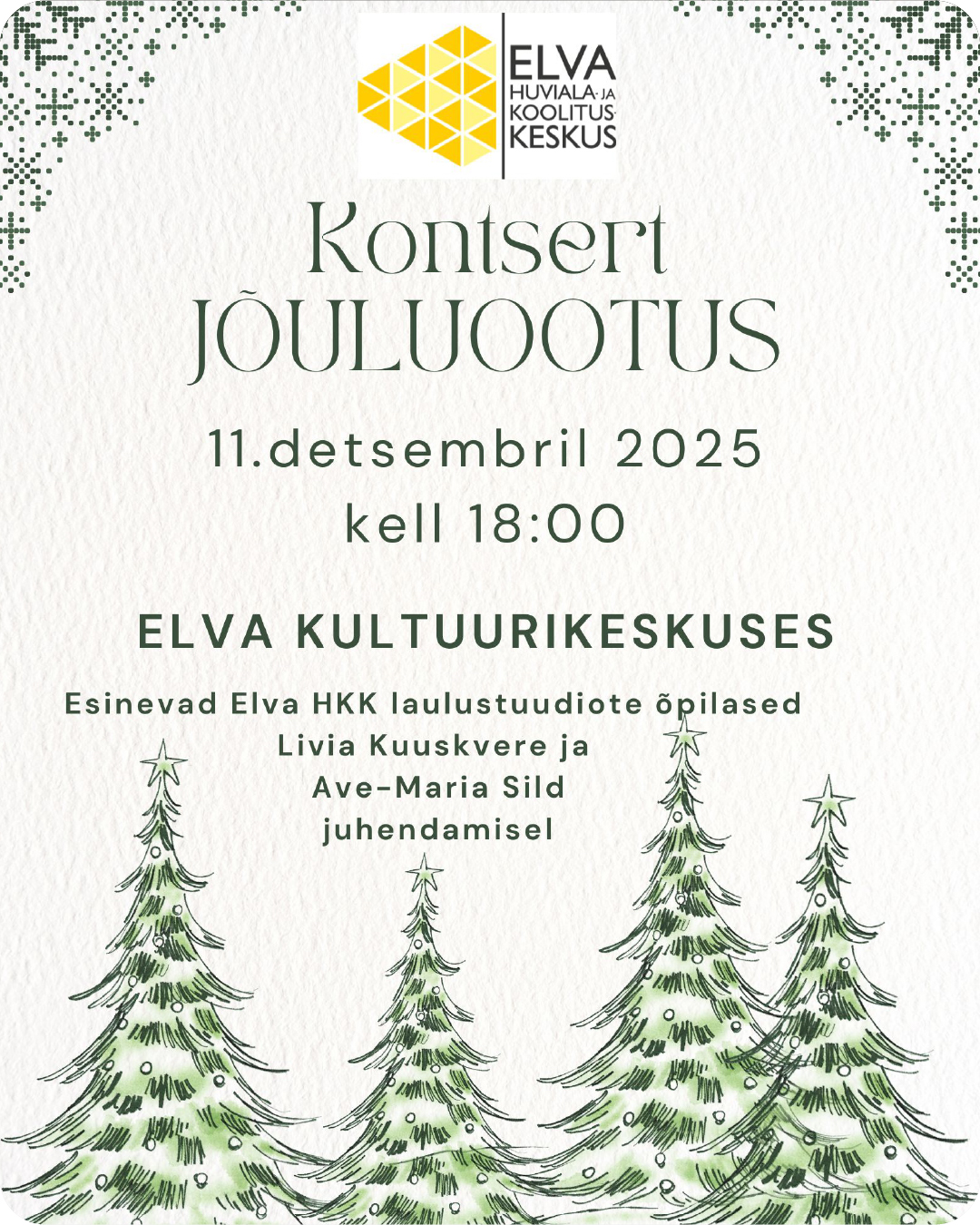 Jõuluootuse kontsert Elva Kultuurikeskuses. Südantsoojendav kontsert, kus astuvad üles Elva HKK laulustuudio õpilased. Noori lauljaid juhendavad Livia Kuuskvere ja Ave-Maria Sild, tuues lavale kauni valiku talvehõngulist muusikat ja jõulutunde.